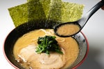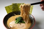 鹿児島・宮崎の豚骨と鶏ガラの濃厚泡スープに、自家製醤油ダレと小豆島の熟成生(なま)醤油で豚骨と鶏油に負けない醤油の香り。 麺は自家製麺の平打ち麺です!